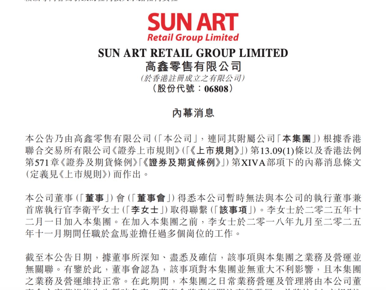 【环球网消费报道 记者 李文瑶】2月4日早间,高鑫零售在港交所发布公告,公告称,公司暂时无法与执行董事兼首席执行官李卫平女士取得联系。