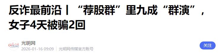 光明网《反诈最前沿丨“荐股群”里九成“群演”,女子4天被骗2回》