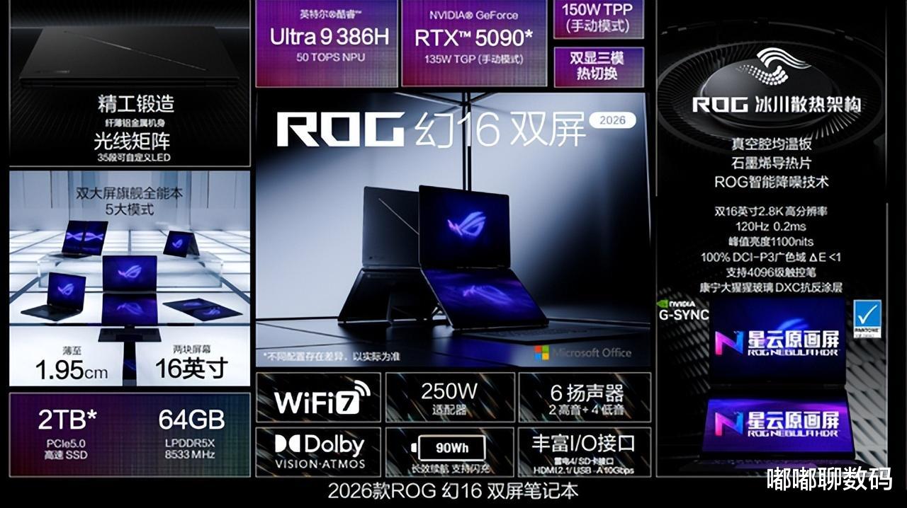 而在 PC 领域,这种变化同样在发生。随着 AI 工具、多任务协作成为常态,传统依赖固定工位、多屏外设的工作方式,开始显得不够灵活。正是在这样的背景下,ROG 在 CES 2026 上带来了颇具话题性的 ROG 幻16 双屏。这款笔记本支持五种形态变换,并搭载全新英特尔酷睿 Ultra 9 处理器 386H,专为提升职场人士的工作效率而打造,同样成为本届展会的一大亮点。