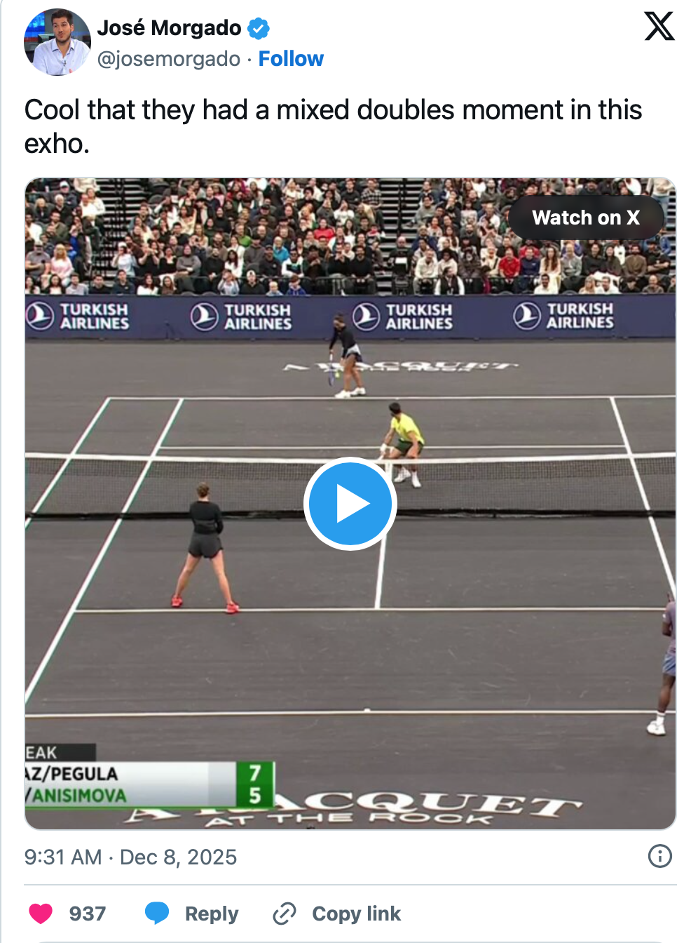 如今来到新泽西,他正在展示“一点点乐趣能带来很大不同”。在混双之前,阿尔卡拉斯于12月7日在单打比赛中不敌蒂亚福,这也是蒂亚福自2021年以来首次击败他。虽然不计入官方交手纪录,但对美国人来说依然算得上是一项成就。