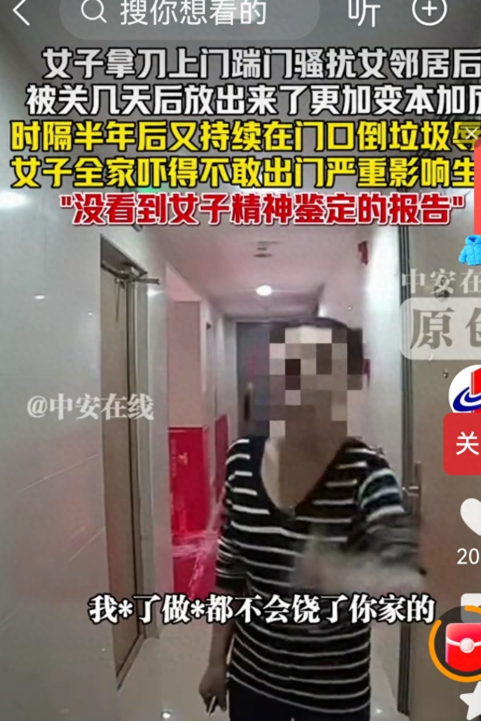 从视频上看到的闹事女子说话语无伦次,“脑控她”以及“闹得她整夜整夜睡不好觉”等言语,以及用菜刀砍邻居家门,往邻居家门口倒垃圾,还有公安机关对其进行拘留又放了和民警让刘女士家人不要和这名女子发生冲突的情况看。大家都怀疑这名女子有精神病。