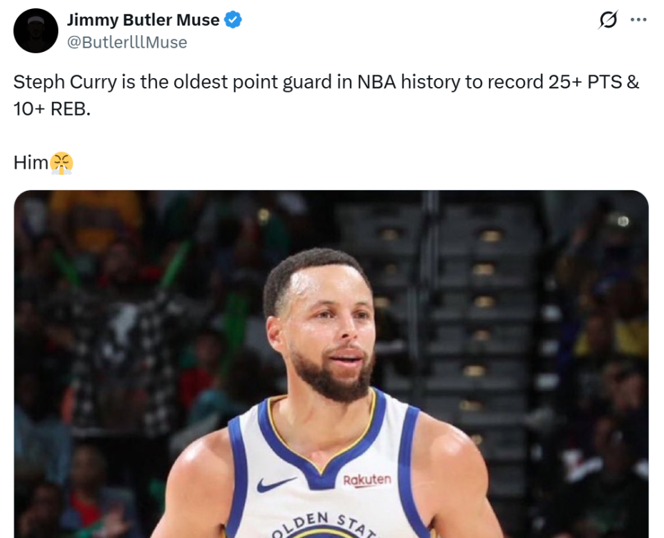 凭借这样的表现,37岁282天的库里成为NBA历史上单场拿到至少25分10篮板最老的后卫。