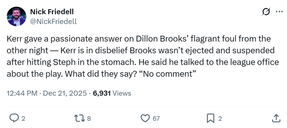 赛后谈到这一事件时科尔再度公开表达不满:“难以置信狄龙竟然没有因为击打库里腹部而被禁赛,我和联盟裁判沟通过此事,但具体得到了什么回复自己无可奉告。”