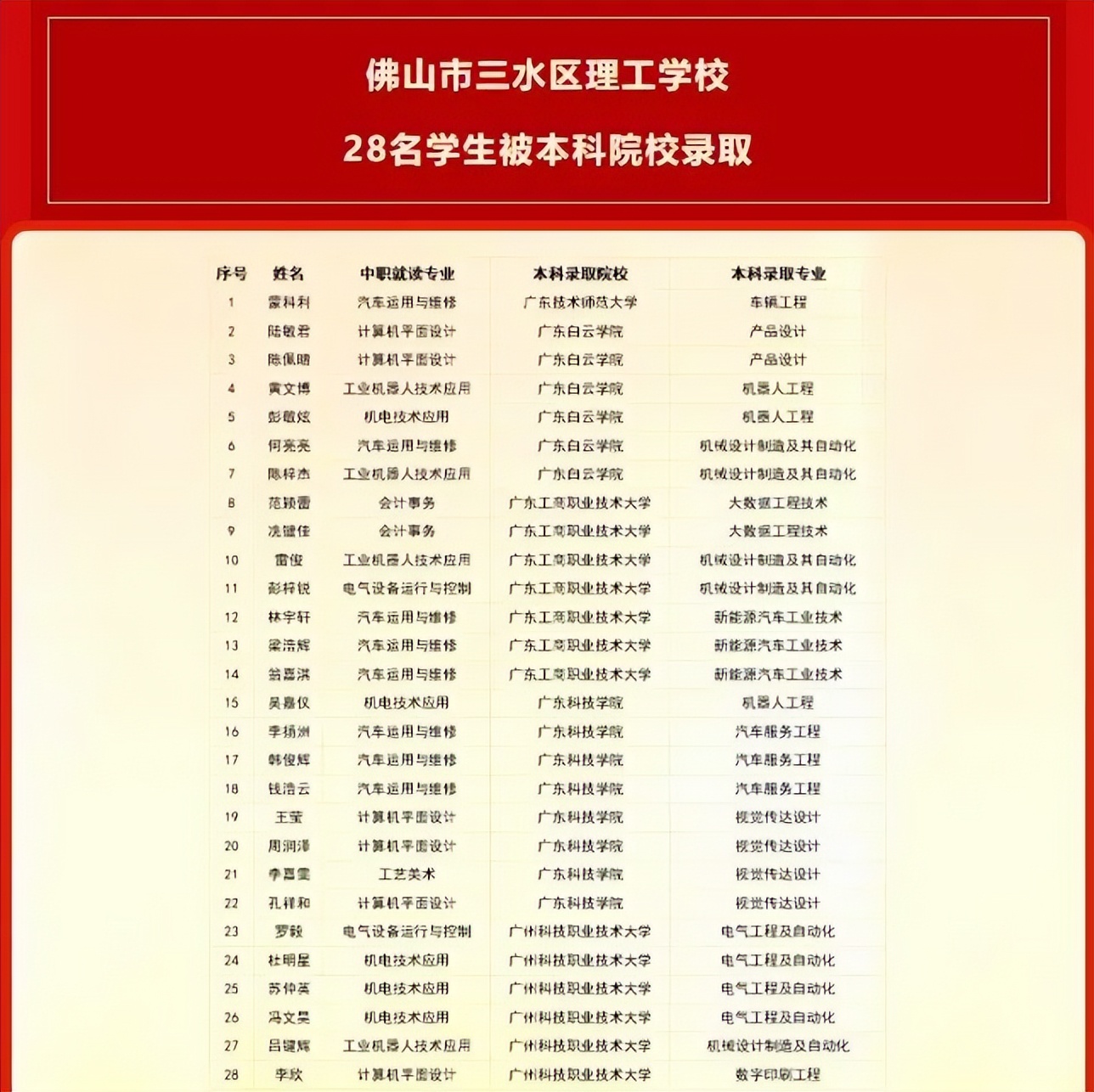 本科录取29人,较2023年增加16人(2023年本科录取13人),在全省中职学校中名列前茅。其中:广东白云学院录取8人、广州科技职业技术大学录取14人、广东科技学院录取2人、广东工商职业技术大学录取5人。