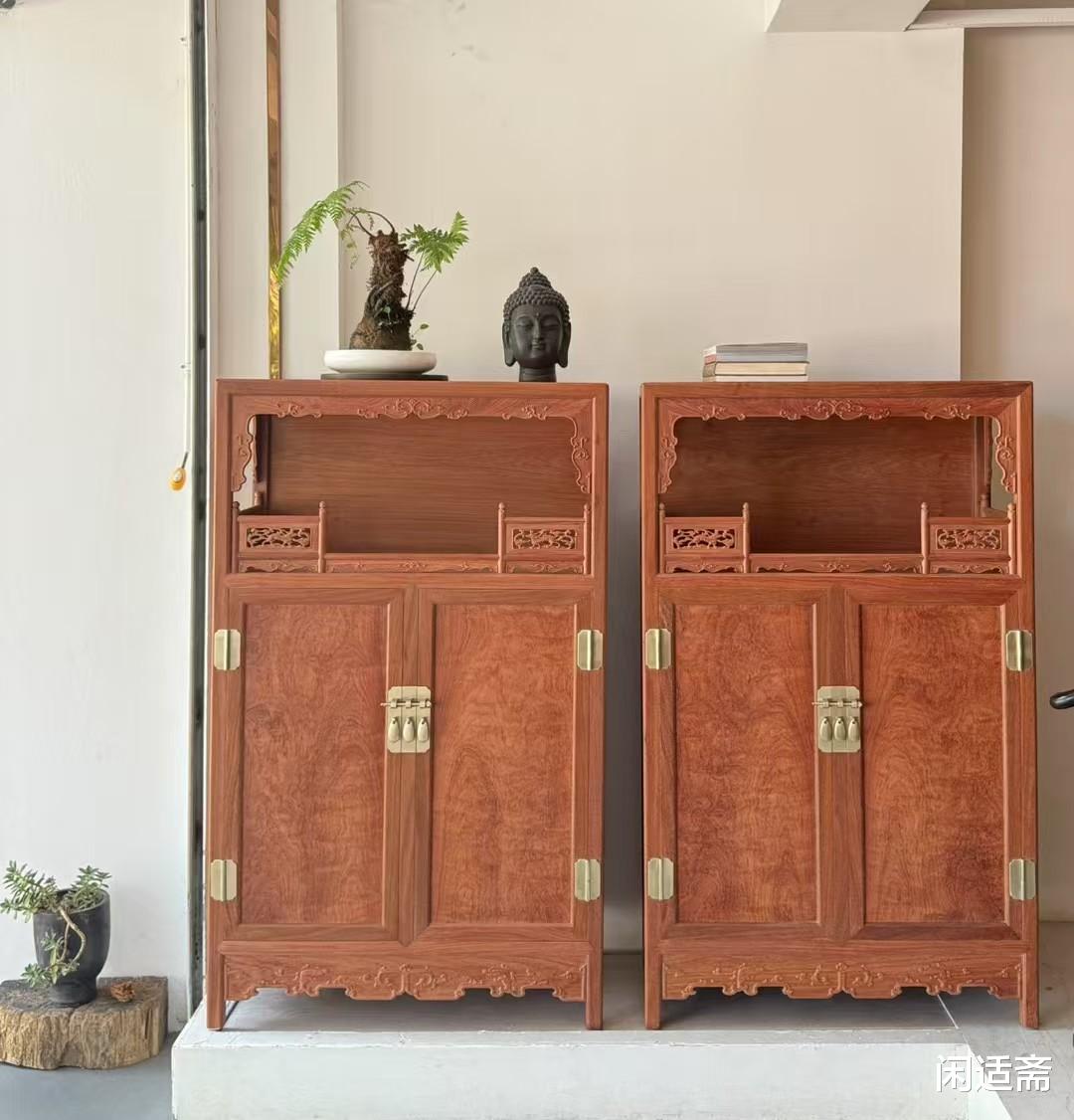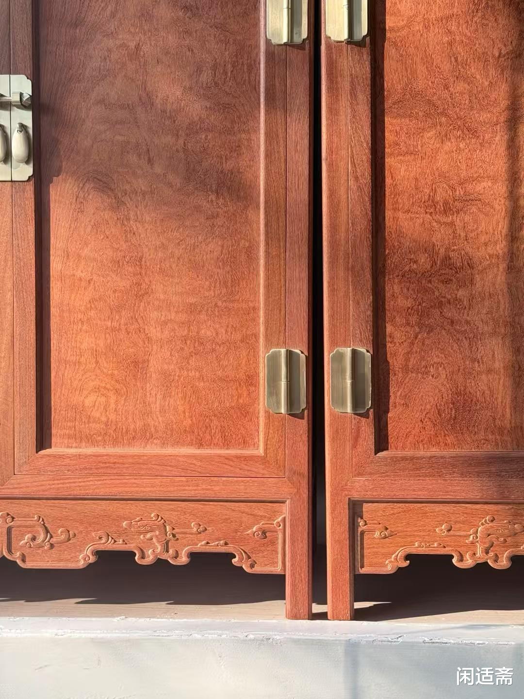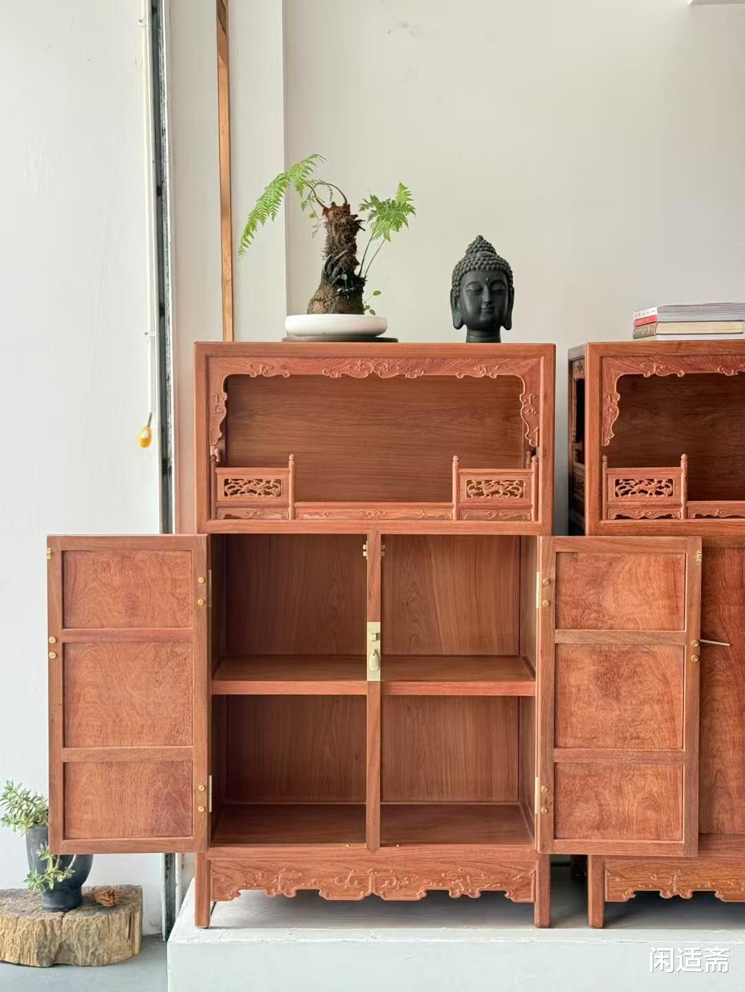 下部为闭合式柜体,采用对开柜门设计,门板选用缅甸花梨独板打造,纹理对称美观,质感厚实温润。柜内设有一层隔板,空间划分合理,既能收纳古籍善本、茶器摆件等大件物品,又能分类存放印章、印泥等小件文玩,兼顾实用性与规整性,完美契合明代文人“藏用相宜”的生活需求。腿足与柜体衔接处采用传统榫卯工艺,严丝合缝、稳固耐用,无一枚铁钉加持,尽显明式木作“榫卯为骨”的精髓,与原器工艺一脉相承。