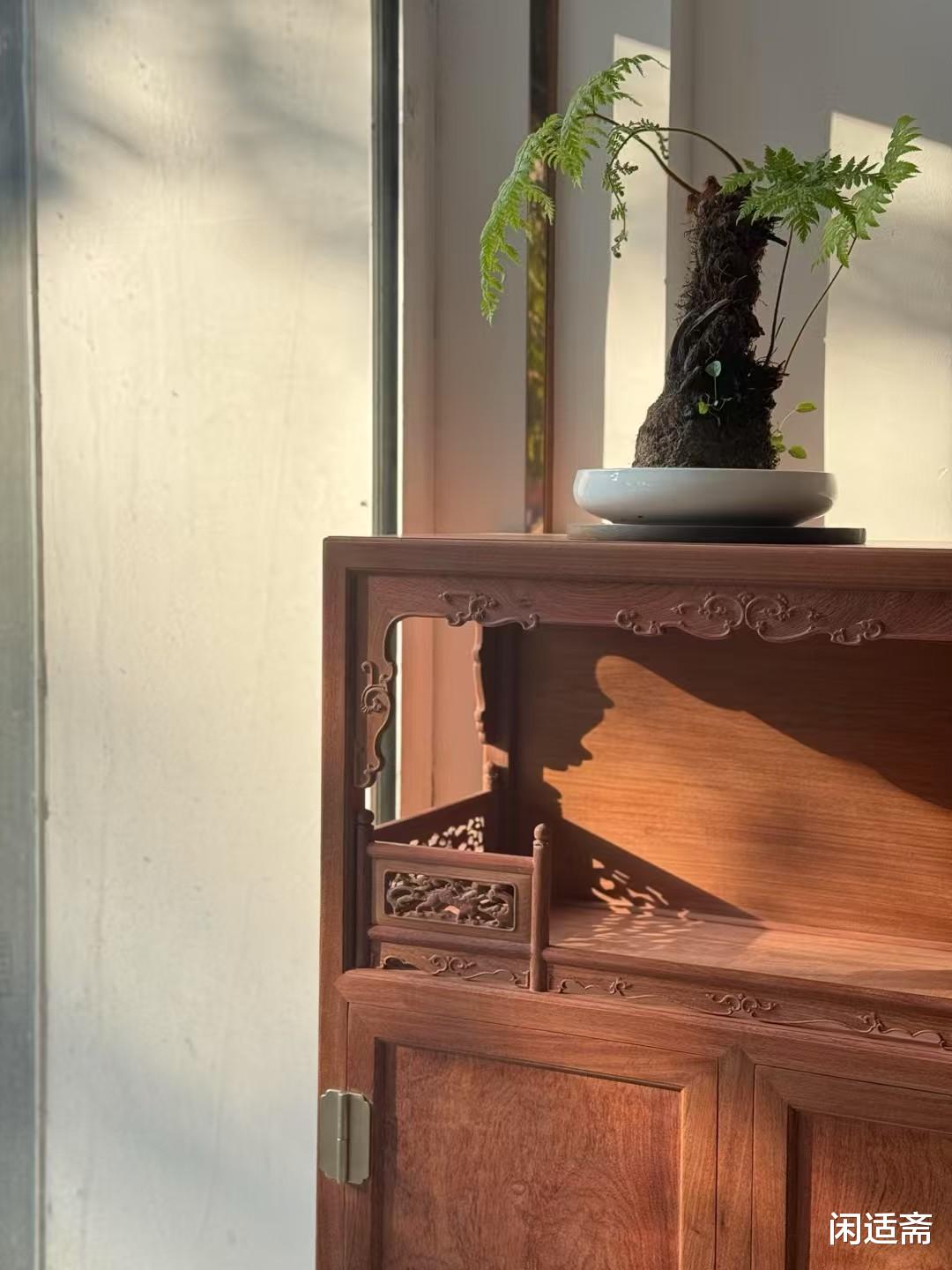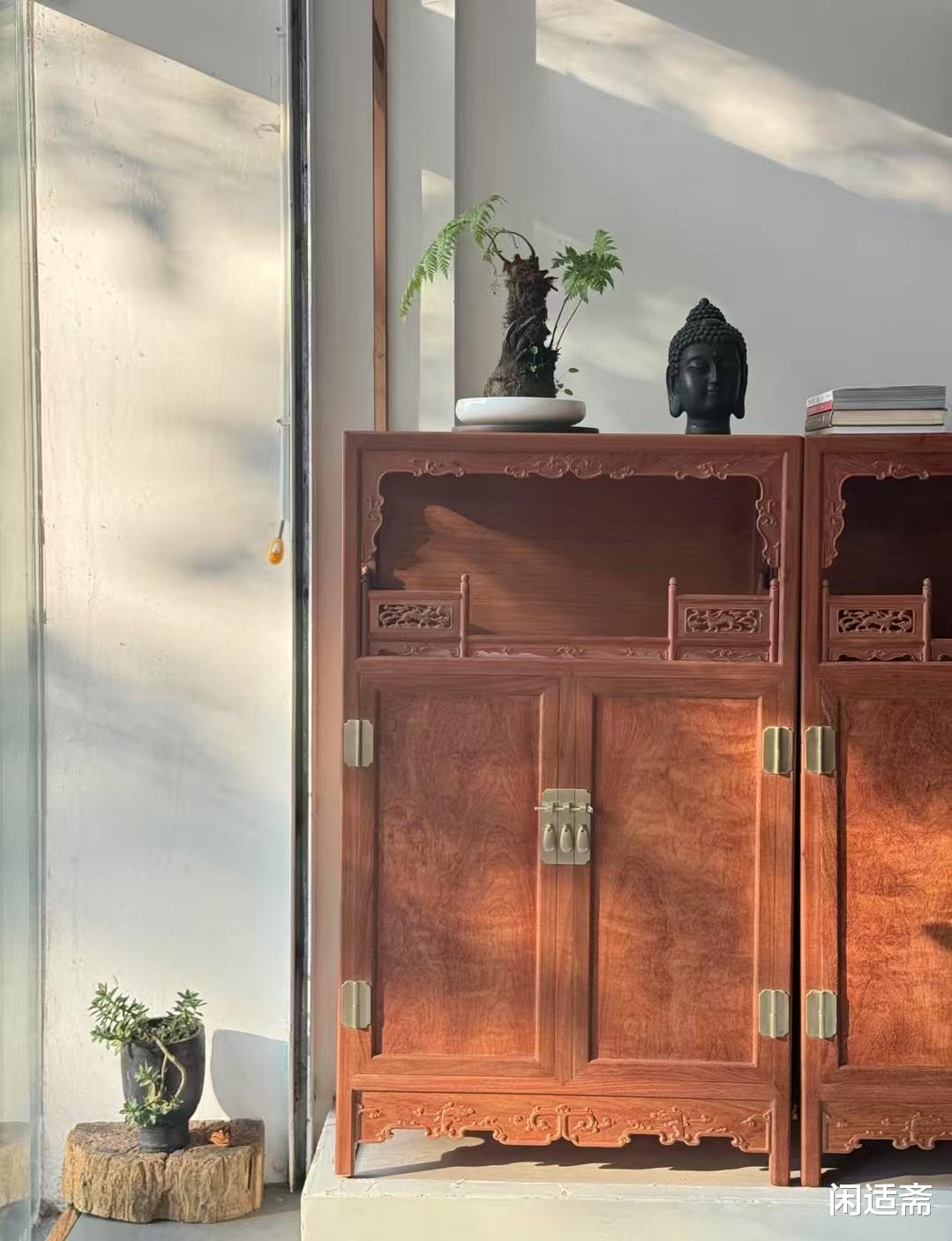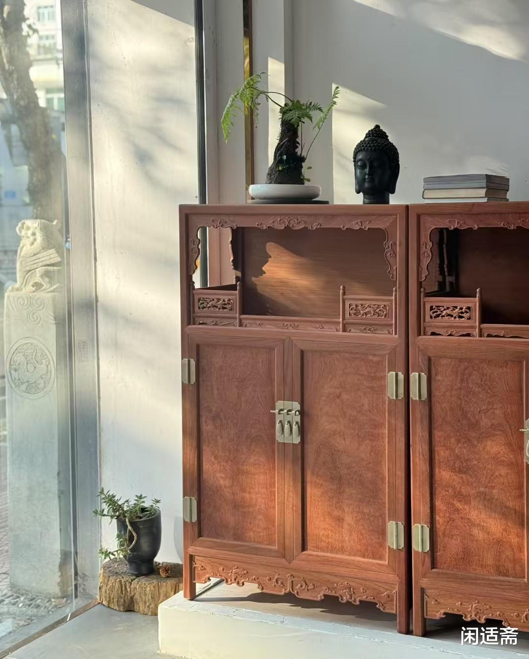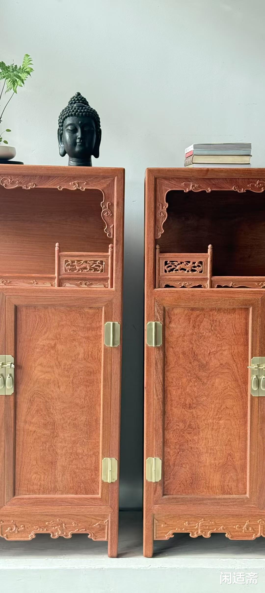 下部为闭合式柜体,采用对开柜门设计,门板选用缅甸花梨独板打造,纹理对称美观,质感厚实温润。柜内设有一层隔板,空间划分合理,既能收纳古籍善本、茶器摆件等大件物品,又能分类存放印章、印泥等小件文玩,兼顾实用性与规整性,完美契合明代文人“藏用相宜”的生活需求。腿足与柜体衔接处采用传统榫卯工艺,严丝合缝、稳固耐用,无一枚铁钉加持,尽显明式木作“榫卯为骨”的精髓,与原器工艺一脉相承。
