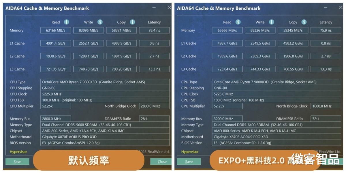 看完供电再看内存,这块板子四条DDR5插槽,最大256GB容量,标称能超到8400MT/s以上。我们直接用了一对雷克沙战神之翼DDR5 6400 C32,进BIOS一键加载AI D5黑科技2.0预设,8000MT/s C36稳稳跑下来。AIDA64实测读取带宽超过85GB/s,写入也有明显涨幅。可能有人会说X3D本身大三缓不太吃内存频率,但实测下来高频低延迟的DDR5在部分生产力和游戏场景里依然能带来可测的帧数提升。关键是这块板子不用你手动去调小参,一键就能接近极限状态,对普通玩家来说省了不少功夫。