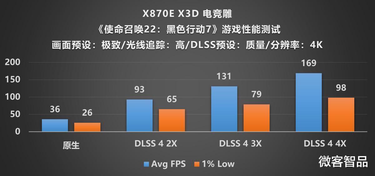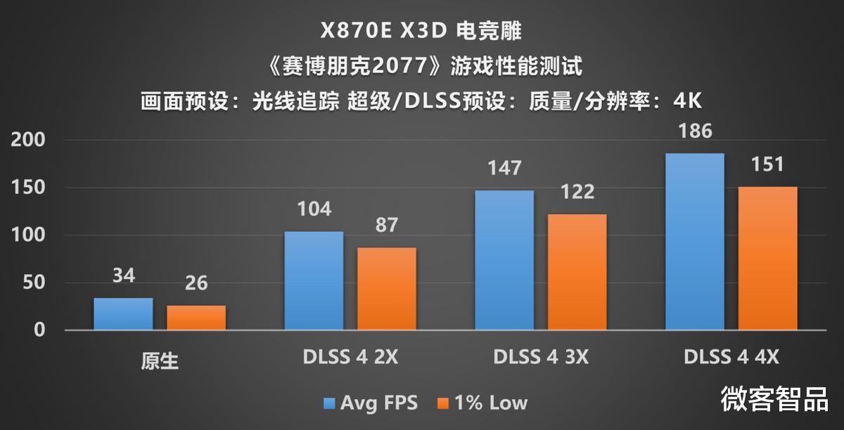 3A游戏测试全程开启X3D鸡血模式2.0,重点验证DLSS 4多帧生成的增益效果。《黑神话悟空》在4K光追中等预设下原生渲染不足30帧,开启DLSS 4 2x后跃升至95帧,切换至4x档位直接达到171帧。《赛博朋克2077》在4K原生超高画质下同样表现低迷,DLSS 4 2x拉到104帧,4x冲到186帧。《使命召唤22黑色行动7》在路径追踪加TAA原生渲染下仅勉强流畅,DLSS 4 2x提升至93帧,4x达到169帧。这些数据证明,X870E AORUS PRO X3D搭配RTX 5080和9800X3D的组合能够完整释放DLSS 4的性能红利,高画质与高帧率不再需要二选一。