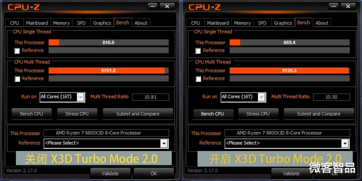聊到核心卖点,X3D鸡血模式2.0才是这张主板最值得说的东西。这个功能在BIOS里开启后,会通过专用硬件模块对CPU频率和内存时序做动态AI调整。我们分别测了关闭和开启两种状态,CINEBENCH R23单核从2078涨到2236,多核从23353升到23611;CPU-Z单线程性能提升了大约7.25%,多线程也有4.16%。数据很清楚地表明,这个鸡血模式2.0确实把9800X3D的Boost频率往上推了一截,而且对轻负载单线程任务的增益尤其明显。