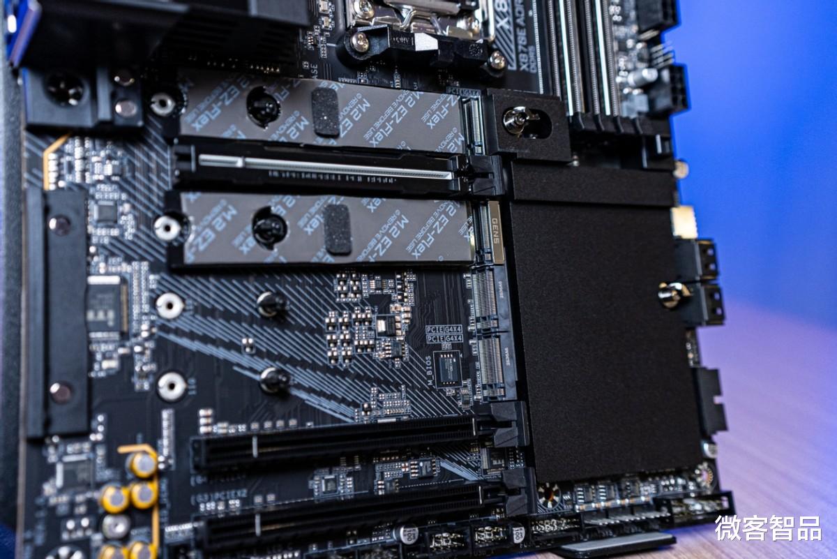 存储扩展也没含糊。两条PCIe 5.0 x4 M.2插槽直连CPU,支持25110规格的大容量盘,旁边还有四条PCIe 4.0 M.2插槽。就算一口气装四条不同品牌的NVMe SSD,主板也全部识别且带宽分配正常,没有通道打架的情况。主PCIe插槽是PCIe 5.0 x16带金属加固,搭配技嘉AORUS RTX 5080实测,就算机箱搬动过,接口连接依然稳固。如果你平时剪视频或者做3D渲染,多块高速SSD带来的素材加载效率提升是能直接感受到的。