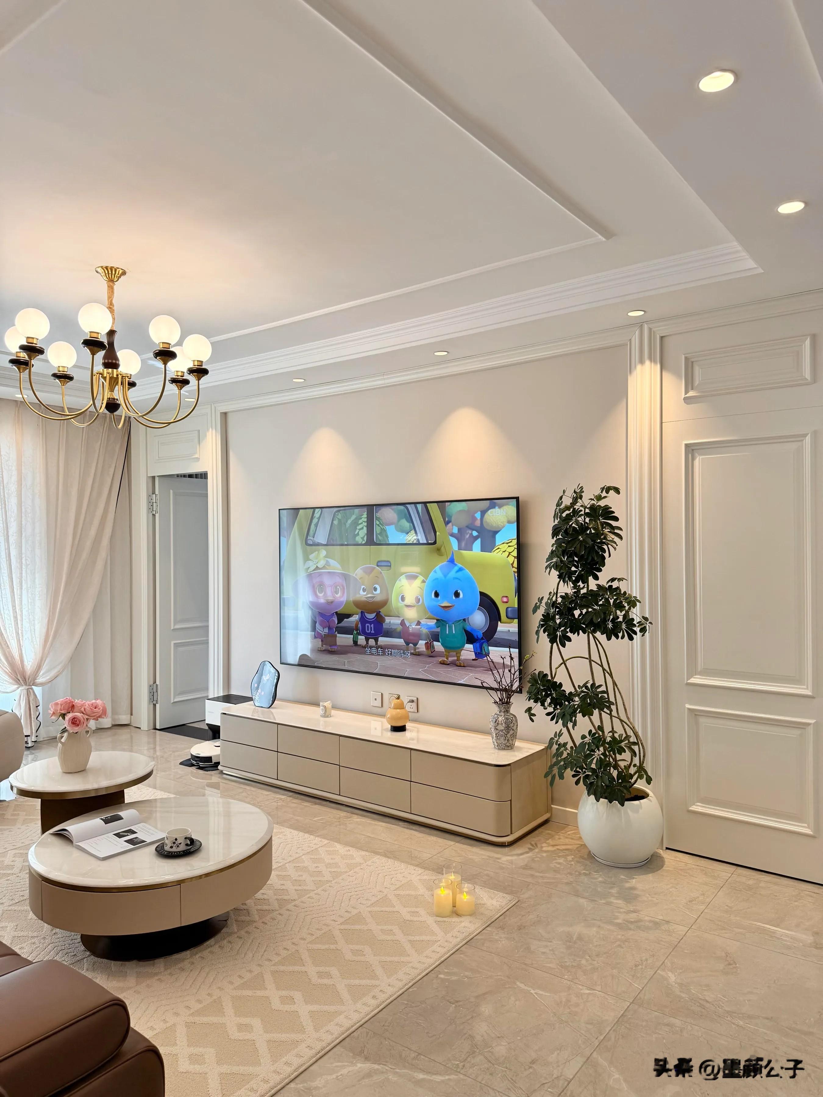 客厅用了简单石膏线+双眼皮吊顶,没有做复杂的法式大角花,电视背景墙5.5米,护墙板隐形门的造型,搭配米色电视柜,高级又有层次感,选择了焦糖色的沙发,焦糖棕的沙发满满的复古感,搭配了米色大理石家具,让客厅眼前一亮,搭配复古印花地毯,很有复古的感觉,治愈又温馨