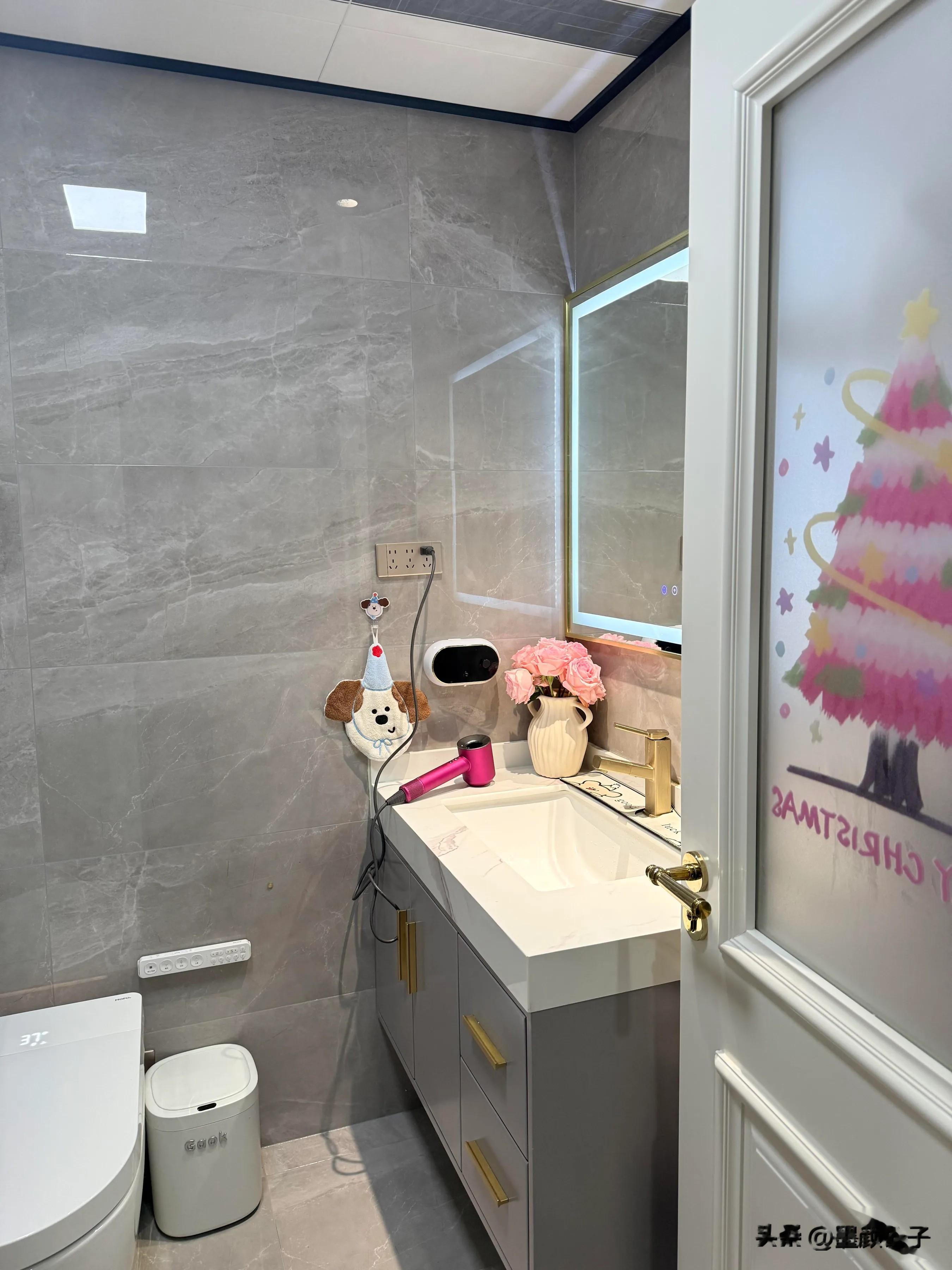 卫生间装修以实用为主,墙地通铺浅灰色瓷砖,亚浅灰色美缝,整体颜色统一,会显大很多,做了干湿分离,洗完澡更好打理地面,整个卫生间瞬间美观又实用。
