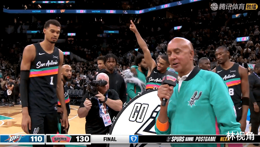 比赛结束,两队球员在场上互相拥抱致意,文班亚马在场边接受记者采访,现场球迷欢声雷动,马刺不但完成了重建,更是具备了夺冠实力。
