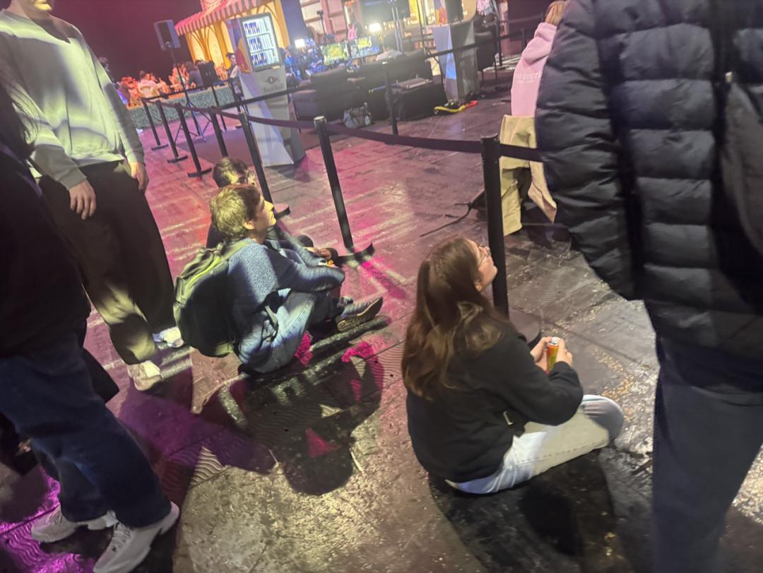 又比方说,赛场旁边就是过道,玩家可以自由穿梭,站在喜欢的选手围身后围观;还有观众三三两两席地而坐,直接从下方仰视选手的屏幕。