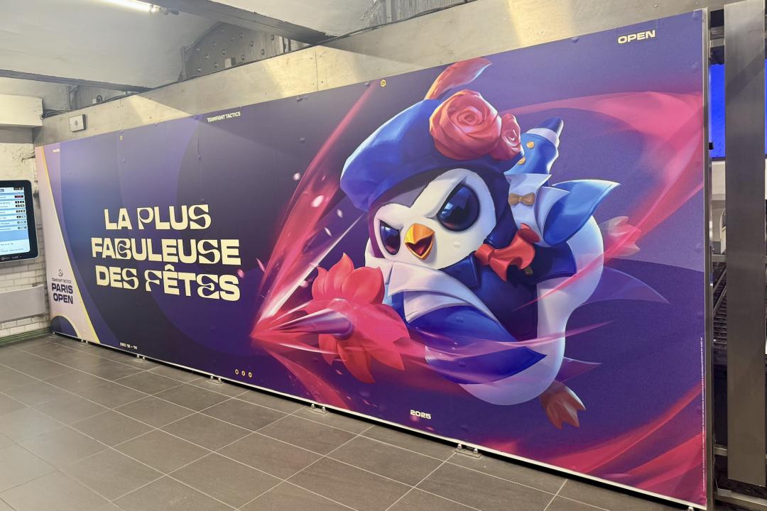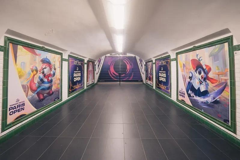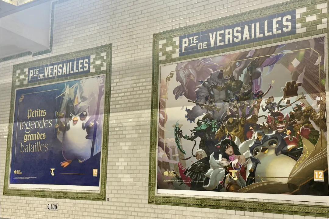 活动前一天,我从机场乘地铁赶去酒店。当地铁到达凡尔赛门站时,我本来还低着头看导航,但抬头的一瞬间,我就知道自己来对了:站厅里已经铺满了云顶之弈的海报,拐角还有明显带着穆夏风格的角色插画。