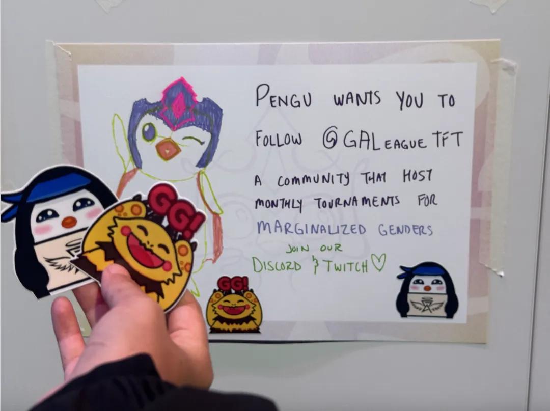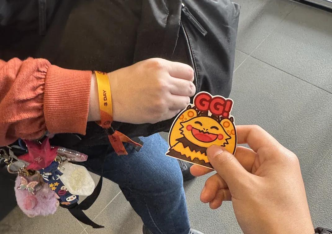 我决赛那天出酒店时,遇到了一位来自美国的女玩家。我瞥到她包包上的胖胖龙挂件,便鼓起勇气搭话。她说自己只是观众,但是随身带着自己做的五百份小贴纸,见到同好就送。她还告诉我,她在洛杉矶组织了一个五百人的女子云顶之弈社区,定期举办内部比赛,说起游戏时,眼睛一直在发光。