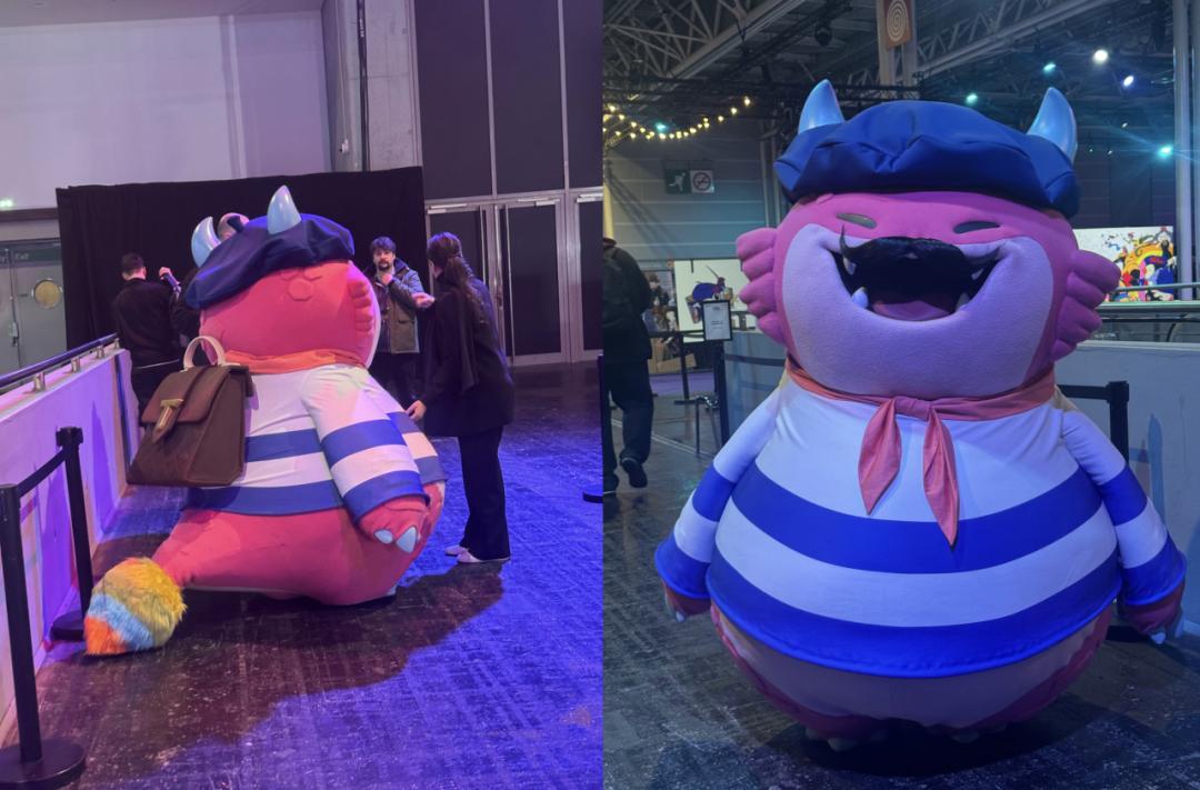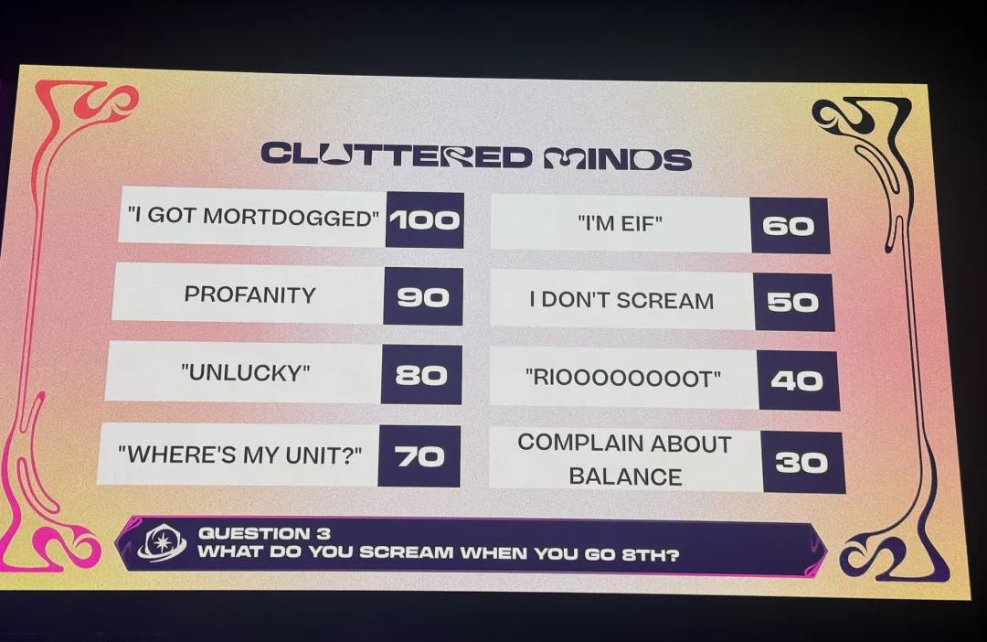 在主舞台区域,一个有趣的活动是请几位设计师参与抢答问题。他们问的并不是游戏机制细节,而是玩家行为:比如一局游戏火速第八出局,玩家通常会喊什么?积100分的答案是 「I got mortdogged」(类似「我被Mort(云顶之弈知名设计师)做局了」)。在开发者说出这个答案的时候,场下翻起一阵笑声。