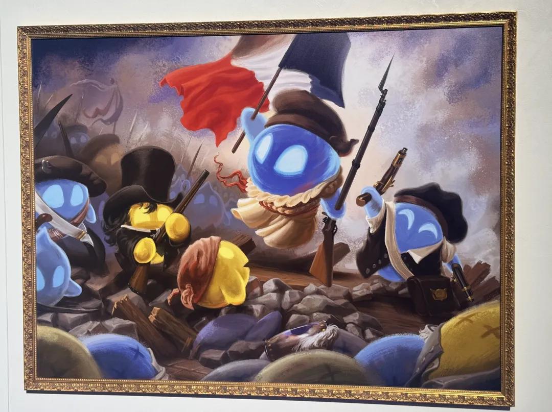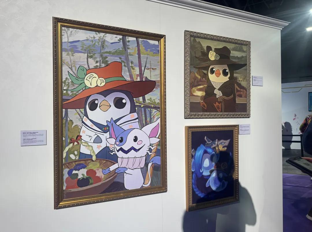入口处陈列着不少经典名画的云顶二创:例如把《自由引领人民》里的女性换成小河灵,把《蒙娜丽莎》换成羽饰骑士。
