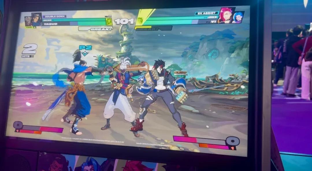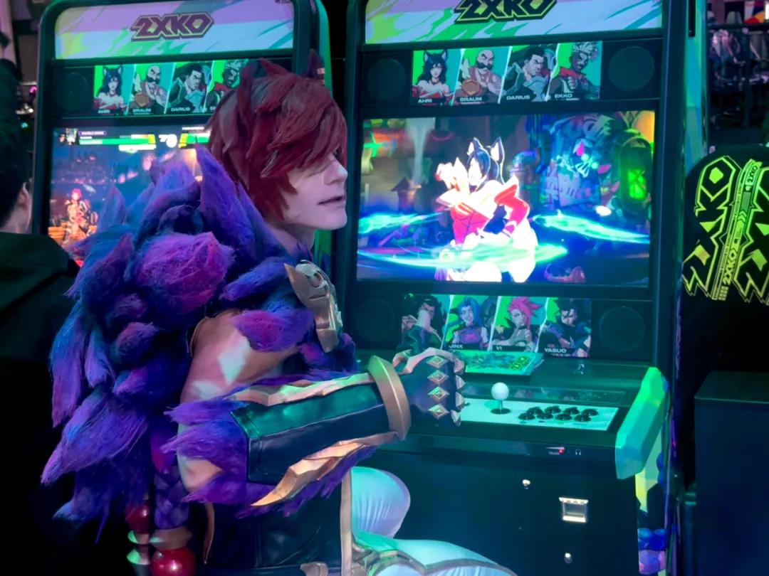再往前走,你可以在《英雄联盟》IP格斗游戏《2XKO》的区域,上去和其他玩家乱搓一把四人战斗。再拿着工作人员给的硬币,去隔壁扭蛋机碰碰运气。