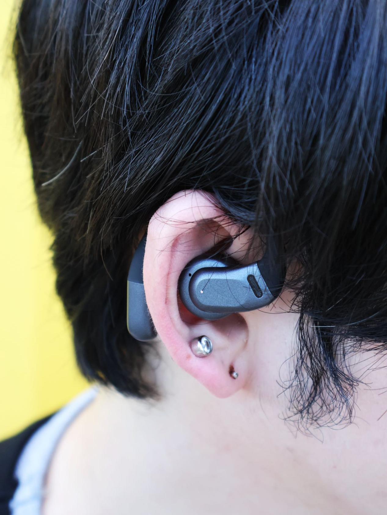 挑选开放式耳机,同样会考察舒适度,上耳无压力,佩戴时间长了也没有压迫感,稳固性总体来说优秀的一方,做一些跑和跳的也能稳稳在耳朵上。