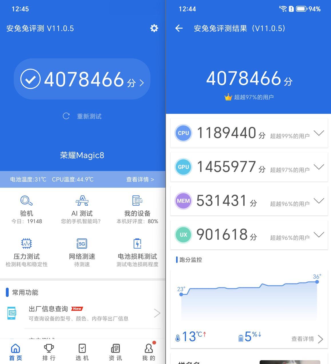 荣耀Magic8搭载的第五代骁龙8至尊版移动平台,采用先进的台积电3nm工艺,为手机提供了强劲的性能基础。在室温28摄氏度的情况下,安兔兔V11.0.5版本中能够拥有407万8千多的跑分。
