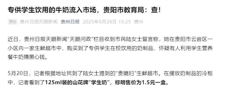 该报道显示,一名贵阳市民在贵阳市云岩区某生鲜超市购买到专供学生在校饮用的奶制品。该乳制品为南方乳业山花品牌的相关产品。