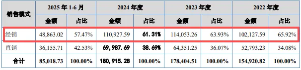 2022年至2025年上半年,公司经销模式收入分别为10.21亿元、11.41亿元、11.09亿元、4.89亿元,占主营业务收入的比例分别为65.92%、63.93%、61.31%、57.47%。
