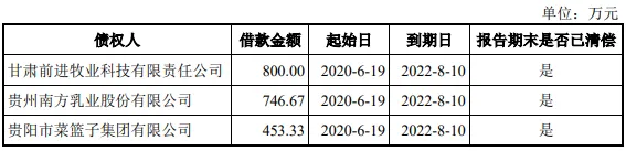 同期,南方乳业另一家控股子公司德联牧业,也向股东甘肃前进牧业、南方乳业、贵阳菜篮子集团借款2,000万元,与丹晟牧业不同的是,该笔借款已于2022年8月全部结清。