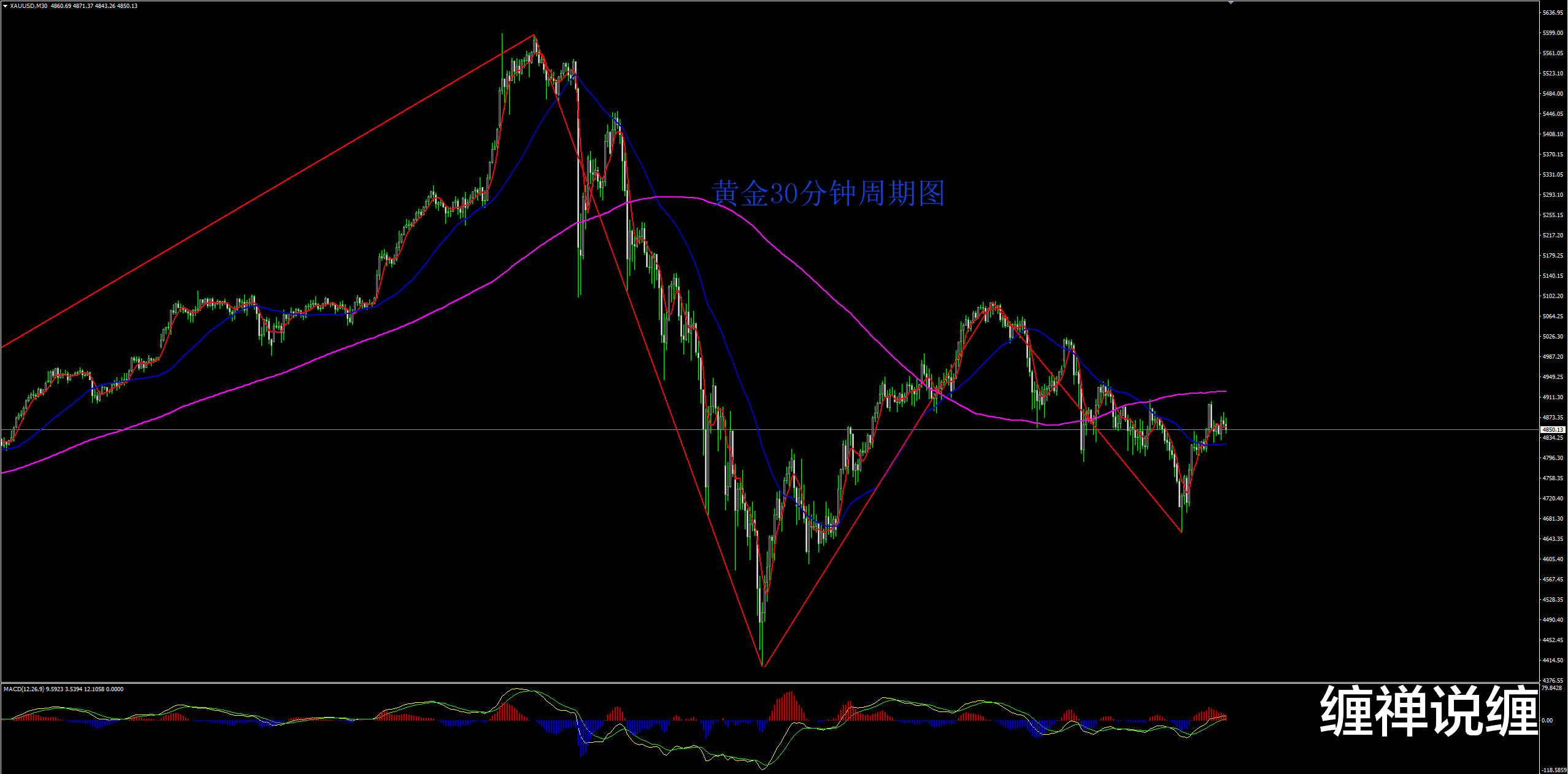 黄金30分钟下探之后开始反弹,如果黄金不再跌破4654,那么黄金30分钟可能还有望延续反弹,不过黄金30分钟反弹也改变不了大区间震荡的结构,黄金30分钟如果反弹遇阻4950,那么黄金30分钟可能冲高回落,如果冲高遇阻4950之后再次下破4800,那么黄金30分钟可能弱势有望延续。黄金还是大区间震荡,注意节奏!