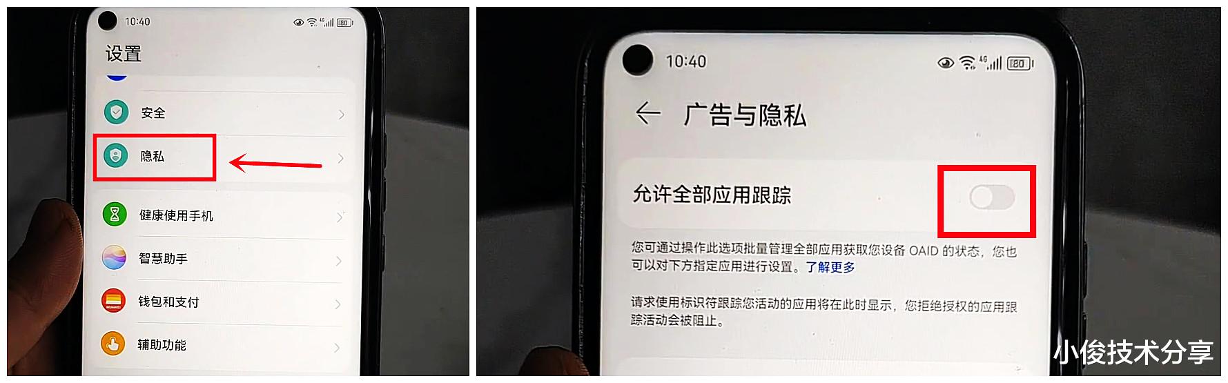 接着返回去,找到隐私,我们点进来,我们往下看,点一下广告与隐私,允许全部应用跟踪。这个按钮是默认也是打开的,我们要挨个把它们全部都关掉,千万不要嫌麻烦。为什么要关闭掉呢?