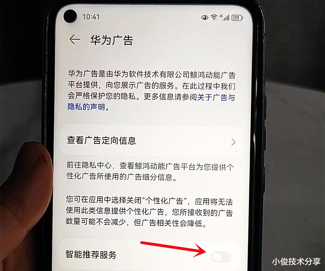 第三个,找到华为广告,点进去,大家看这个智能推荐服务,默认也是打开的,这个开关大家也切记一定要关掉。为什么呢?