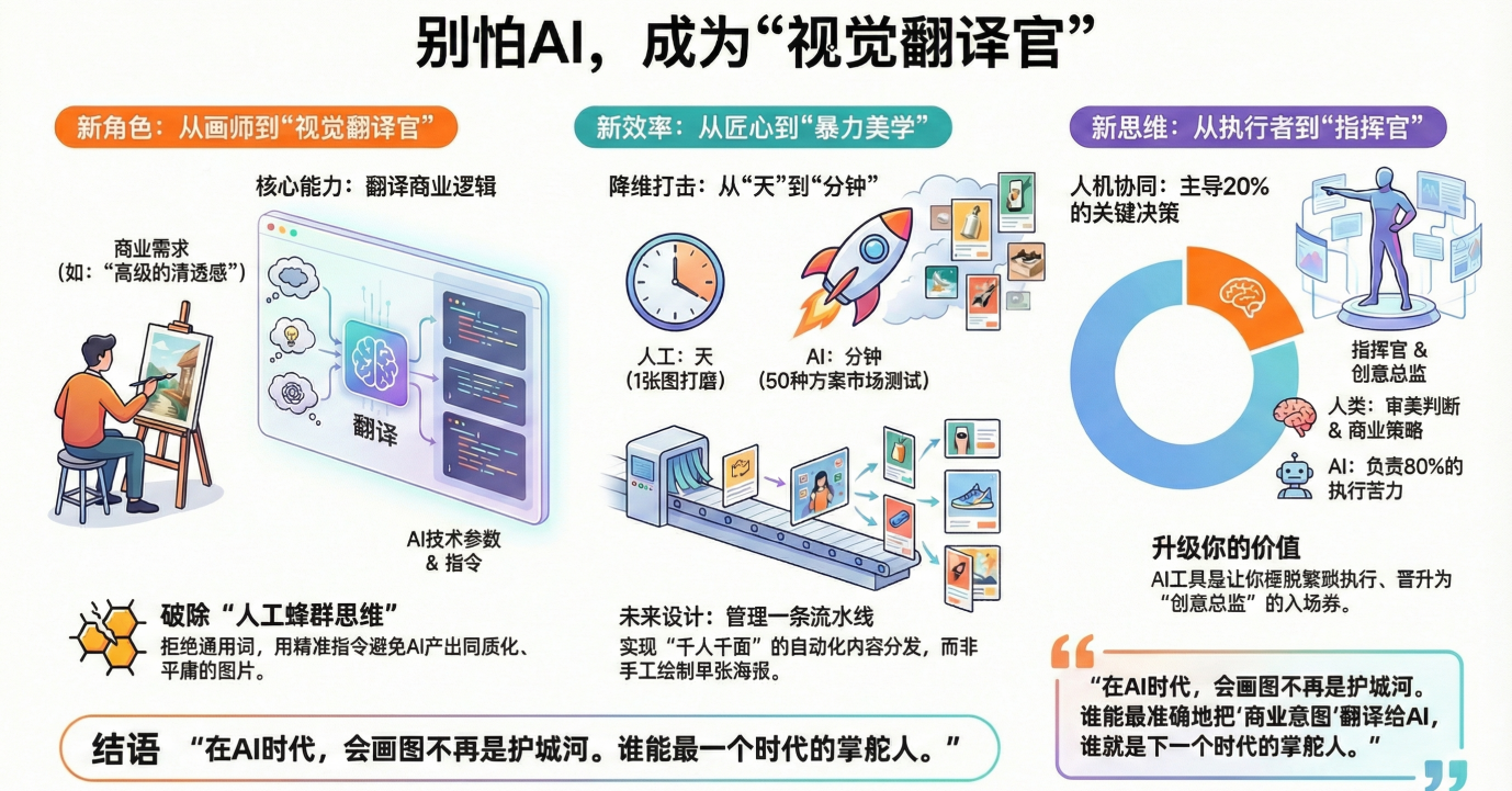最后送大家一句话:在蒸汽机发明后,力气大不再是优势;在AI时代,会画图也不再是护城河。谁能最准确地把“商业意图”翻译给AI,谁就是下一个时代的掌舵人。