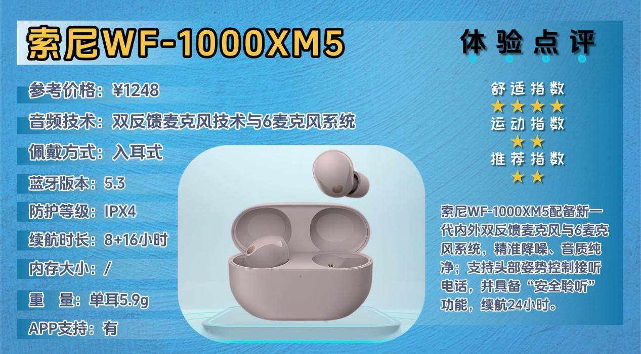 WF-1000XM5防护级别为IPX4,可防汗防飞溅雨水,适合轻度运动或短时户外活动使用。续航约24小时(它含充电盒),单次佩戴可使用数小时,不用频繁充电。佩戴舒适度高,耳塞贴合耳道,不易掉落,但由于体积偏大和降噪功能主要面向静态场景,不太适合剧烈运动或高强度户外运动。总体更适合通勤、办公或日常休闲使用。