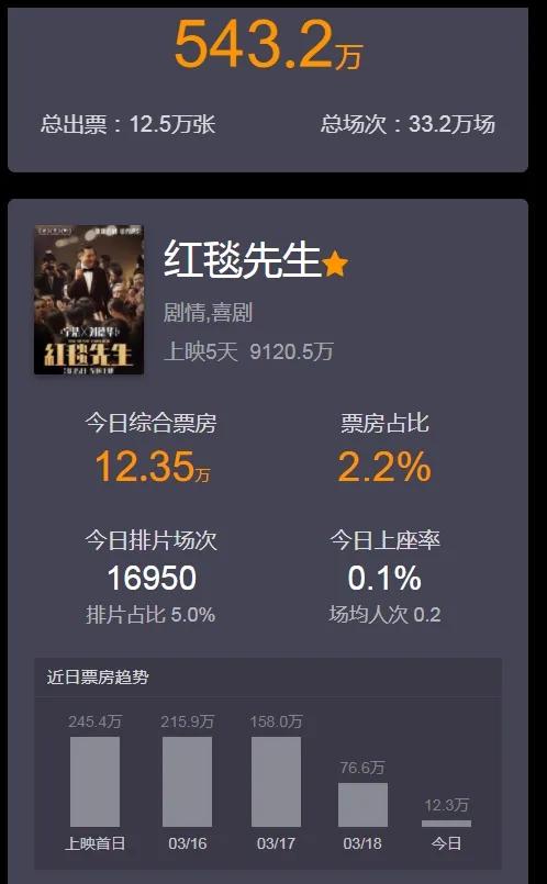 我们先来看看《红毯先生》的票房数据。虽然电影在上映初期获得了一定的关注度,但票房增长却远远低于预期。即使是在五一档这样的黄金档期,电影的票房也没有出现明显的反弹。不仅如此,电影在上映过程中还经历了撤档和重新上映的风波,这无疑给电影的票房表现雪上加霜。