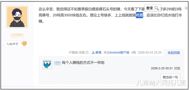也有玩家看得通透:死搬砖不如巧赚钱。与其苦哈哈多开押镖,不如走 “捷径”—— 有人专蹲鸣霄玩法,低价收号、简单养成再转手,一单轻松赚几百;还有《逆水寒》的 “江湖倒爷”,才是真・赚钱天花板。