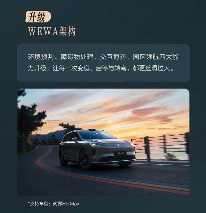 辅助驾驶方面:1、升级WEWA架构的环境预判、障碍物处理、交互博弈、园区领航四大能力;2、新增三点式掉头功能,在系统判断一次转向无法完成掉头时,将自动调整倒车空间;3、城区车道巡航辅助增强,辅助驾驶员控制车辆按交通规则通过路口,智能识别红绿灯,遇到加塞、水马时能及时避让。便捷操作方面:1、新增隔空开启后备箱功能,在后备箱车牌中心处抬脚即可触发自动开启尾门;2、新增“捷停车”智感停车服务,开车出“捷停车”合作停车场时,可通过车机服务卡片或小艺建议一键缴费。