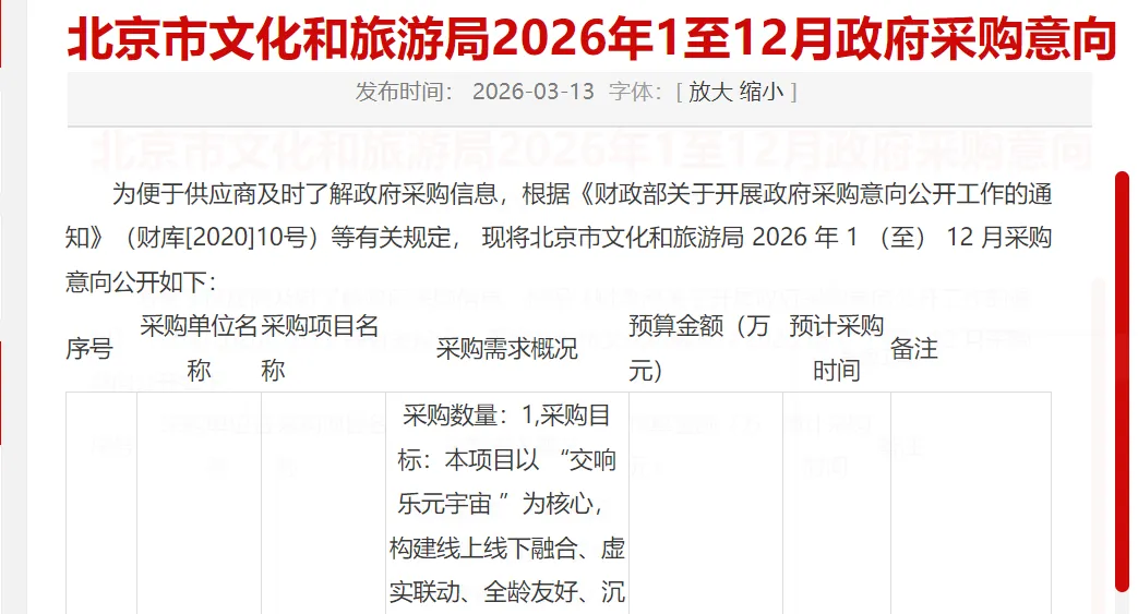 3月13日,北京市文化和旅游局发布2026年1至12月政府采购意向。