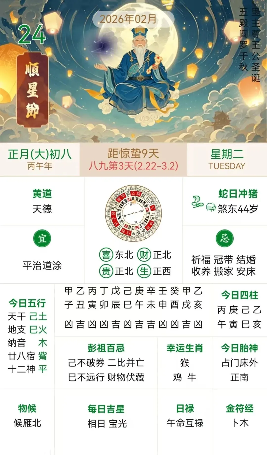 小运播报:2026年2月24日,星期二,农历正月初八(丙午年庚寅月己巳日),法定工作日