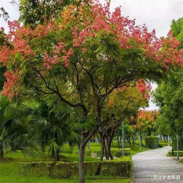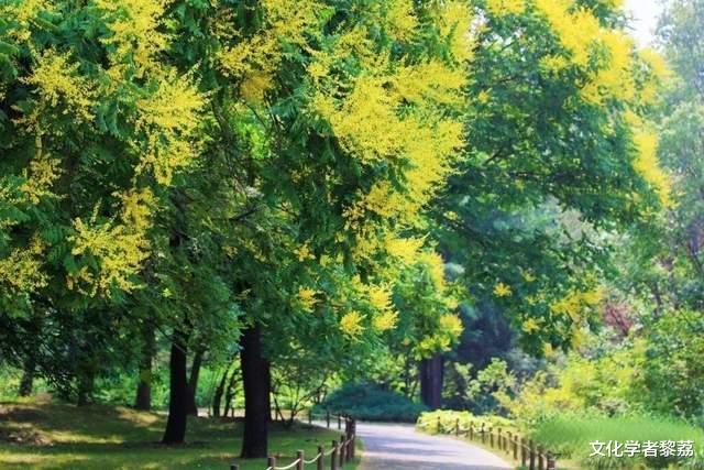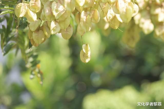我拣了张栾树下的长椅坐下。秋天最美的树,非栾树莫属。栾树的花期在秋天,因为树高大,花的位置也很高,生在树冠顶端,朝着天空伸展。栾树的花不是一下子就全开的,而是一条条金黄色的细小花柱,层层舒展,依次在枝头粲然开放。所以,秋天坐在栾树下,总是一地细碎的金芒,如同铺了一层地毯,让人总不忍心踩踏。秋风掠过,明黄的栾花洋洋洒洒落在肩头发上,心不由得亮堂起来。间或,还坠落一个个栾树果实——三瓣又薄又脆的果皮围拢成三棱形,深浅不一的深红酒红,像小灯笼一样的可爱。坐在栾树下,蓊蓊郁郁的叶子,在渐沉的暮色里连成一片墨绿的穹顶,映着疏疏落落的树影,以及天边那一抹将尽未尽的霞光,这便是我此刻的世界了,一个由我的心绪与外物共同酿造出的、微醺般的恬静世界。