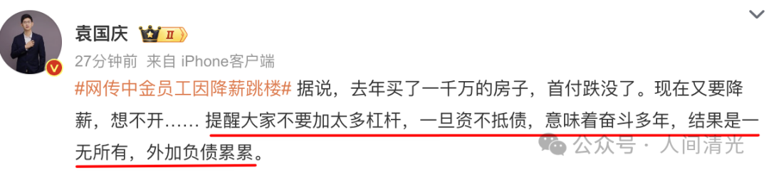 现在的网络传播速度很快,如果没有“权力插手干预”控评删热度之类,很多内容都无法藏匿。此前网上曝光的内容为“该员工因为降薪导致房贷压力过大而跳楼。”