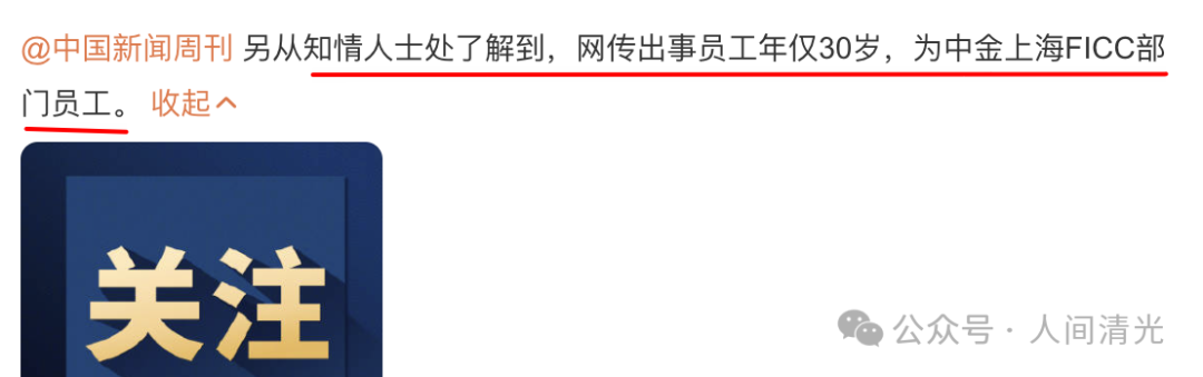 这个消息很大概率是真的,因为中国新闻周刊也透露,他们从知情人士处了解到,该出事员工年仅30岁,为中金上海FICC部门员工。