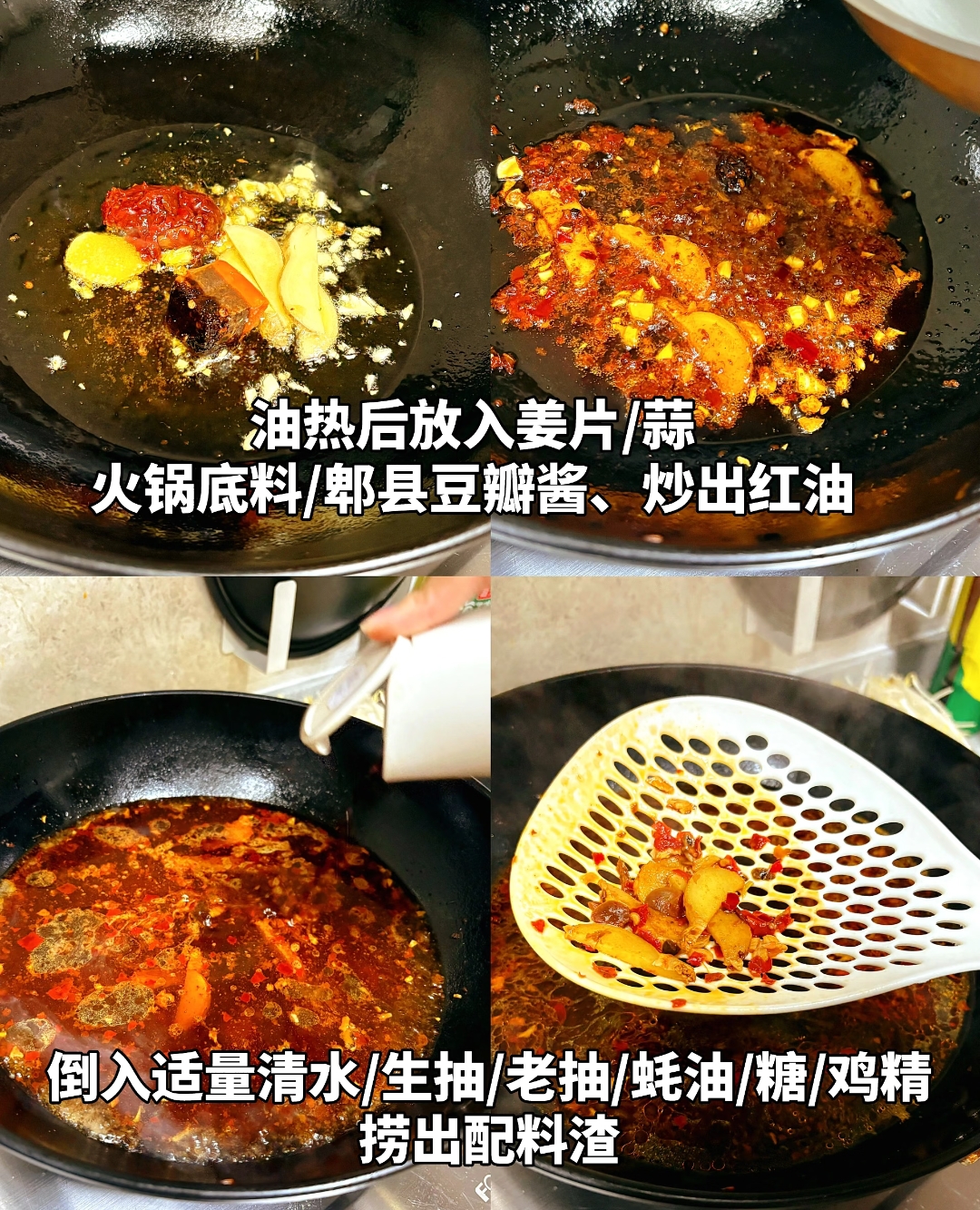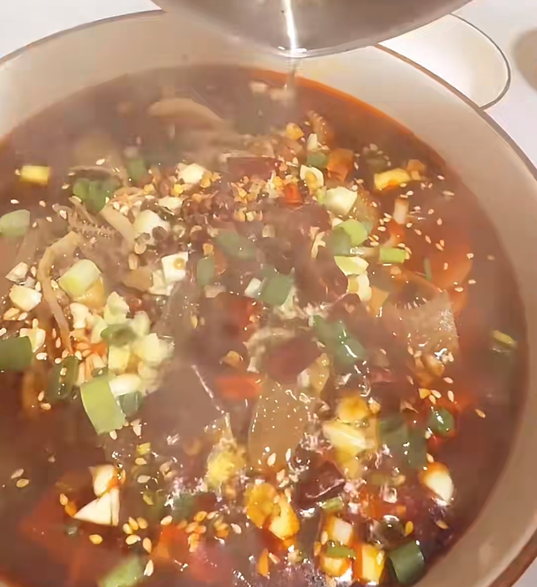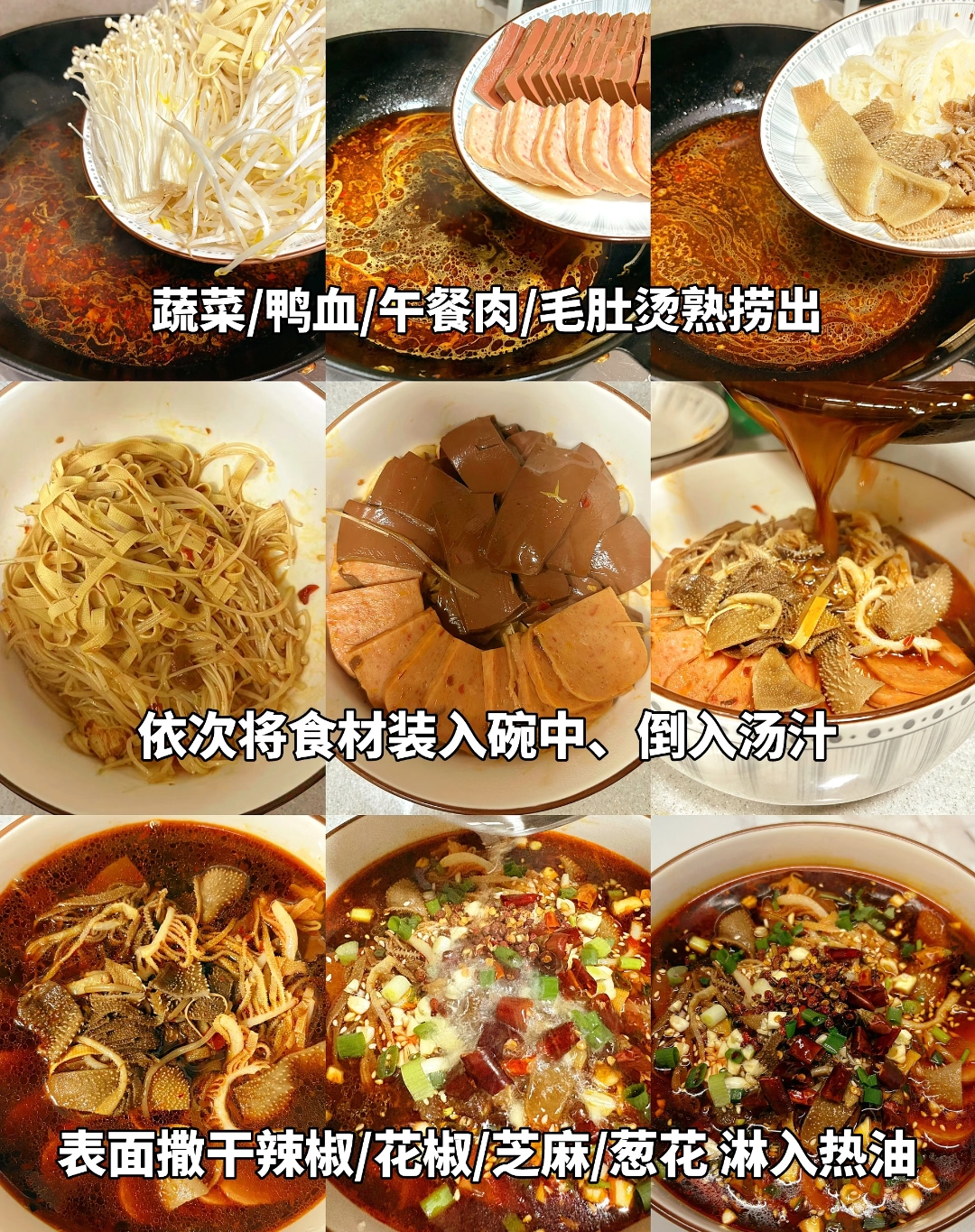 汤底是毛血旺的灵魂。往炒出的红油中加入适量清水,大火煮开后,调入生抽、老抽、蚝油、白糖和鸡精,让咸鲜麻辣的底味更加丰富立体。待汤汁沸腾,香料充分释放后,为了成菜的清爽美观,需用漏勺捞出锅内的配料渣,只留下纯净红亮的汤汁。随后,依照食材易熟的程度依次入锅。豆芽、金针菇等垫底的蔬菜先煮,煮熟后捞出铺在碗底;紧接着放入鸭血、午餐肉、豆皮等主料,让它们在沸腾的红汤中充分吸收滋味,煮熟后连同汤汁一起倒入碗中,此时,满满一大碗红彤彤的菜肴已然令人垂涎欲滴。