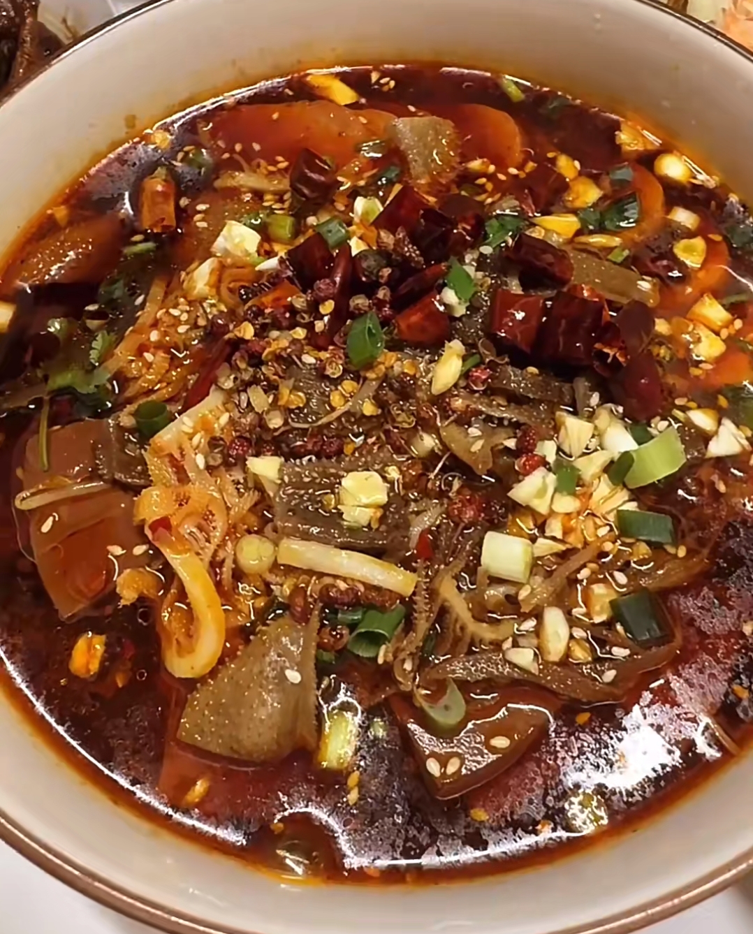 最后一步,堪称毛血旺的“注入灵魂”时刻。在碗中食材表面,均匀地撒上葱花、白芝麻、干辣椒段和花椒粒。另起锅烧油,将油温烧至极高,看到油面微微冒烟时,迅速淋在佐料之上。伴随着“滋啦”一声脆响,热油瞬间激發出辣椒的焦香与花椒的酥麻,香气瞬间爆发,在空气中弥漫开来。这最后的一泼热油,不仅锁住了汤汁的热度,更将麻辣鲜香推向了顶峰。看着这碗红亮油润、香气四溢的毛血旺,所有的忙碌都化作了此刻的食欲,那一口热辣鲜香的滋味,正是对这道经典川菜最好的致敬。