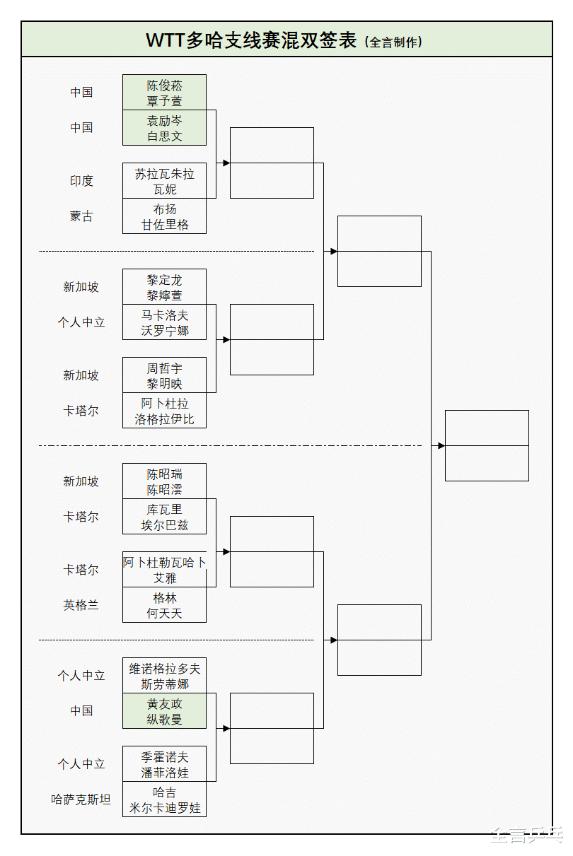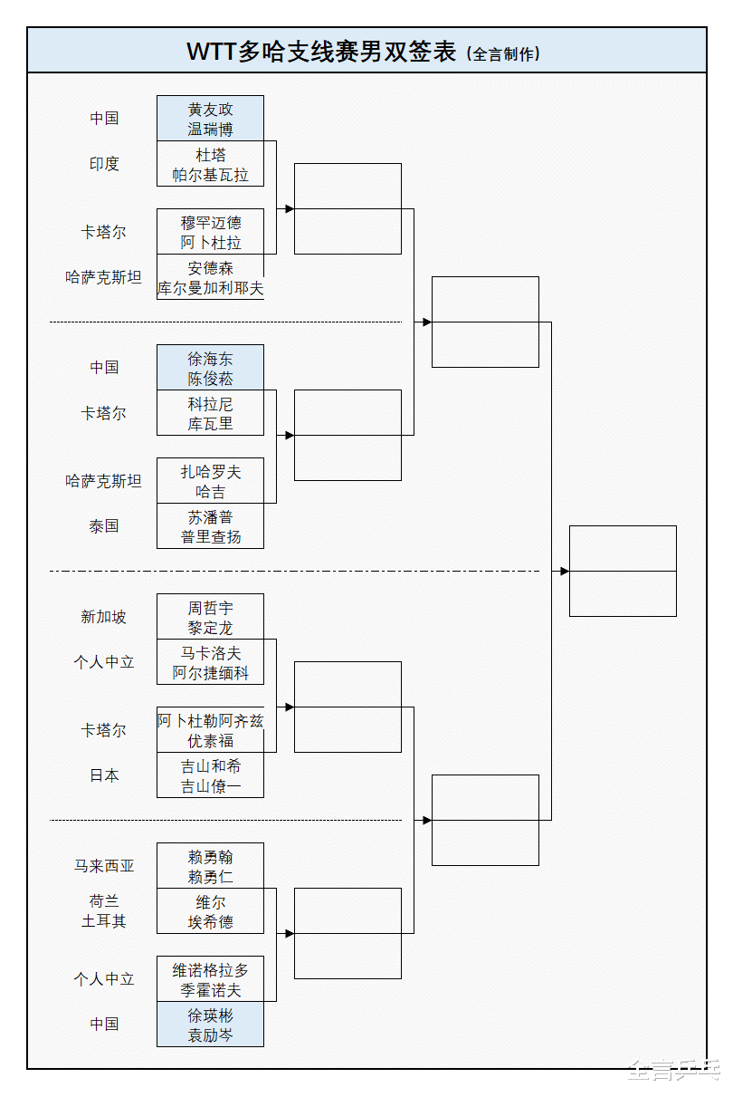 双打方面,国乒在每个项目中都是2对组合位列上半区、1对选手被安排在下半区,其中黄友政/温瑞博、覃予萱/纵歌曼、陈俊菘/覃予萱成为头号种子,此外混双首轮也要打1场内战——以下为5项正赛的完整抽签结果: