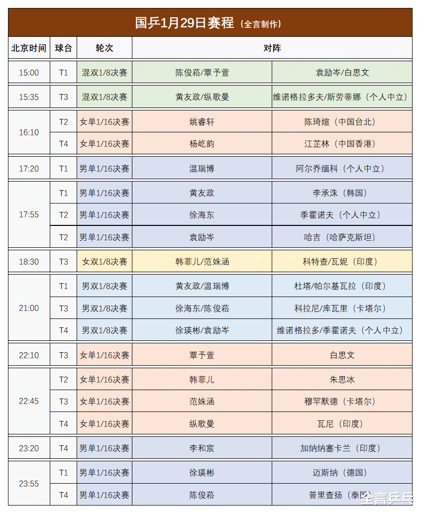 根据安排,1月29日上半场国乒将迎来1场内战与8场外战,赛程如下:
