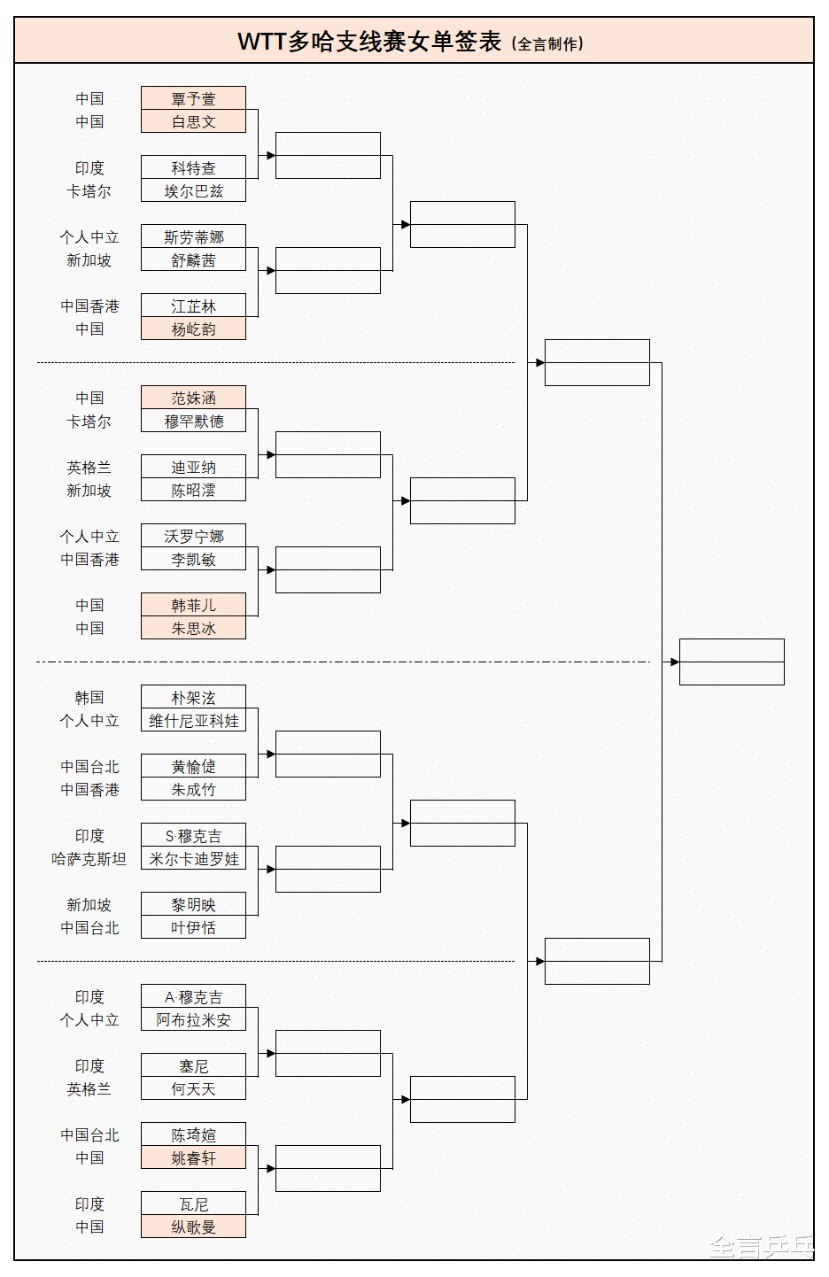 资格赛结束后,所有5大项目的完整签表出炉,其中国乒男单上半区5人、温瑞博成为头号种子,下半区2人、陈俊菘是二号种子;女单上半区不但有6位国乒选手,而且还会爆发2场内战,其中覃予萱是头号种子,另外2人则在下半区、纵歌曼是二号种子。