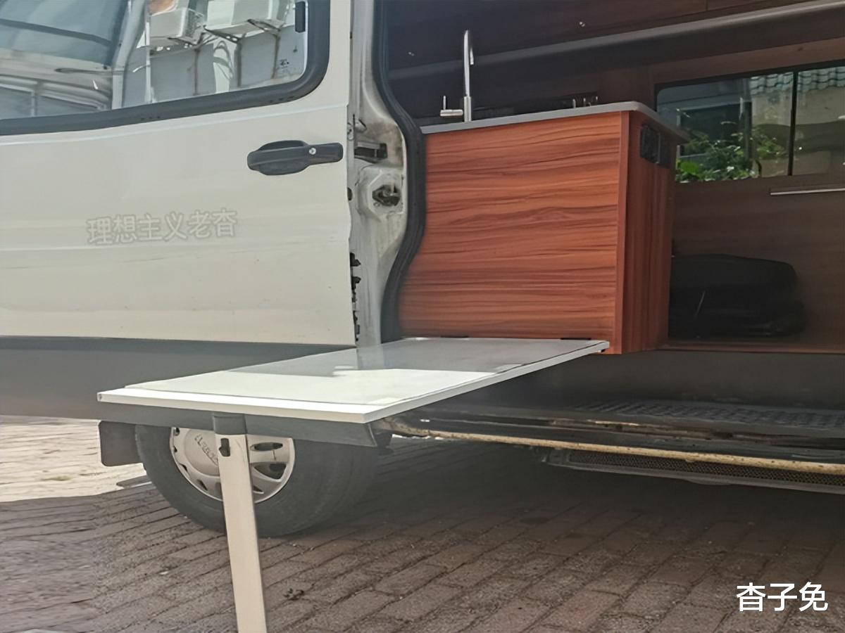 打开中门,门口就是微厨区,折叠小桌板可作为案板使用,车内厨柜里面有水有电有炊具,上面有洗菜池,带上食材就可以在旅途中做饭。
