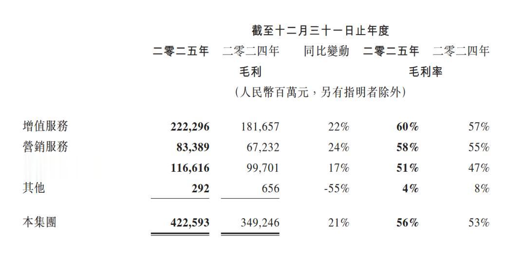 回顾整个2025年,这两项开支分别为417亿元、1361亿元,同比分别增长15%、21%。考虑到核心业务毛利率的提升——增值服务、营销服务、金融和企业服务的毛利率分别有3至4个百分点的提高,整体经营费用率只上涨了1个百分点。