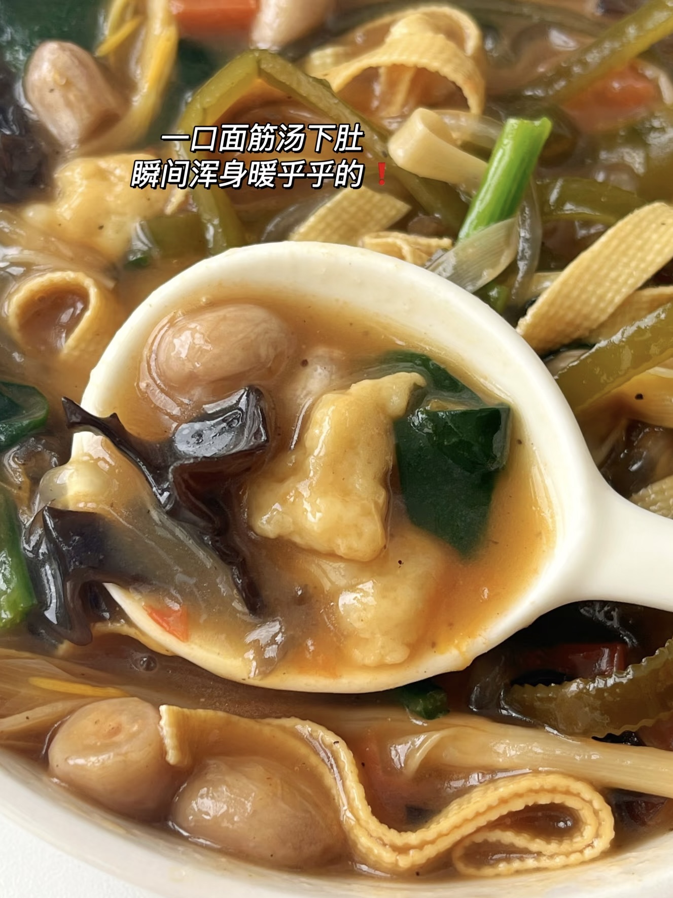 成品亮相:汤色奶白透亮,挂着晶亮油花;面筋块金黄饱满,像一颗颗“小海绵”;彩虹配菜色彩缤纷,点缀其间;葱花绿得晃眼,像给奶白汤点了“森林星光”。先来一口汤——暖、鲜、滑、稠,四层味觉依次炸开;再嚼一口面筋——软糯像豆花,轻轻一咬,汤汁在舌尖爆开;再嚼一口粉条,“呲溜”一声滑进喉咙,带着木耳的脆、黄花菜的嫩、海带的鲜,配一口米饭,汤汁渗进米粒,不知不觉碗底朝天;空口喝也过瘾,暖到手指都想跳舞。