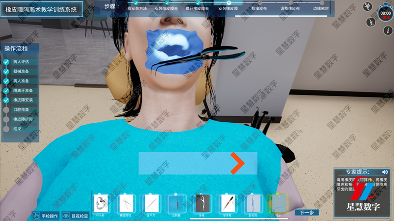 在牙体牙髓治疗的临床操作中,橡皮障被誉为无菌治疗的基石。然而,对于许多初入临床的口腔医学生而言,第一次在患者口中安放橡皮障往往是一场手忙脚乱的战斗:孔位对不准、翼板卡不住、橡皮布撕裂……这些尴尬时刻不仅耗费时间,更容易挫伤学生的自信心。如今,星慧口腔数字化虚拟仿真平台正在改变这一传统教学痛点。